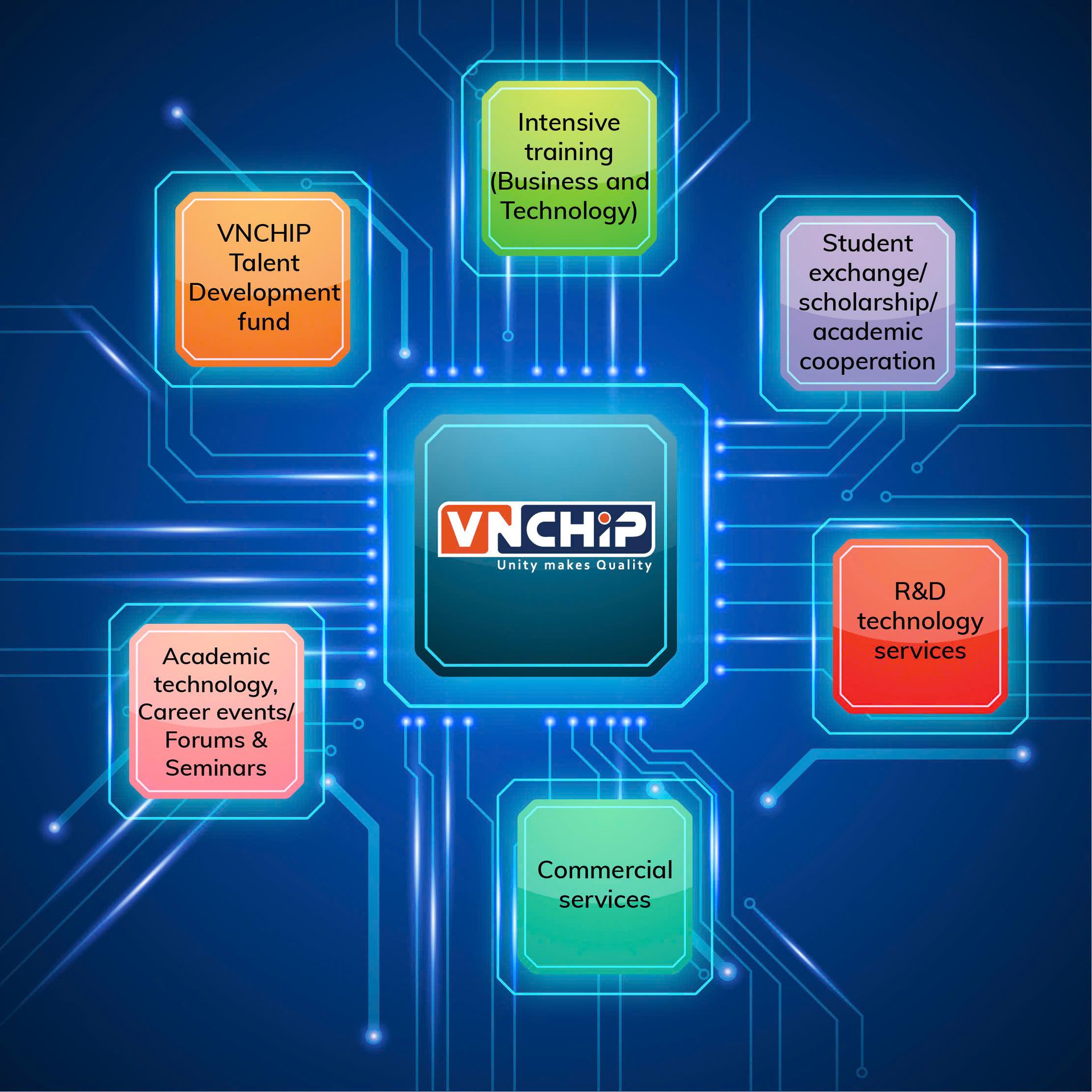The VNCHIP ecosystem integrates training, research, academic collaboration, talent development funding, and technology–commercial services, creating a comprehensive environment for talent growth and innovation.